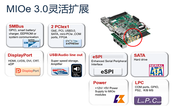 MIOe擴展接口是研華自主推行的擴展接口標(biāo)準(zhǔn),高度集成的設(shè)計能夠節(jié)約20%的系統(tǒng)空間。MIOe 3.0包含了如下常用的功能信號,客戶可在擴展底板上直接使用,從而可將精力投入產(chǎn)品核心功能的開發(fā),大大加速了客戶創(chuàng)新產(chǎn)品上市。