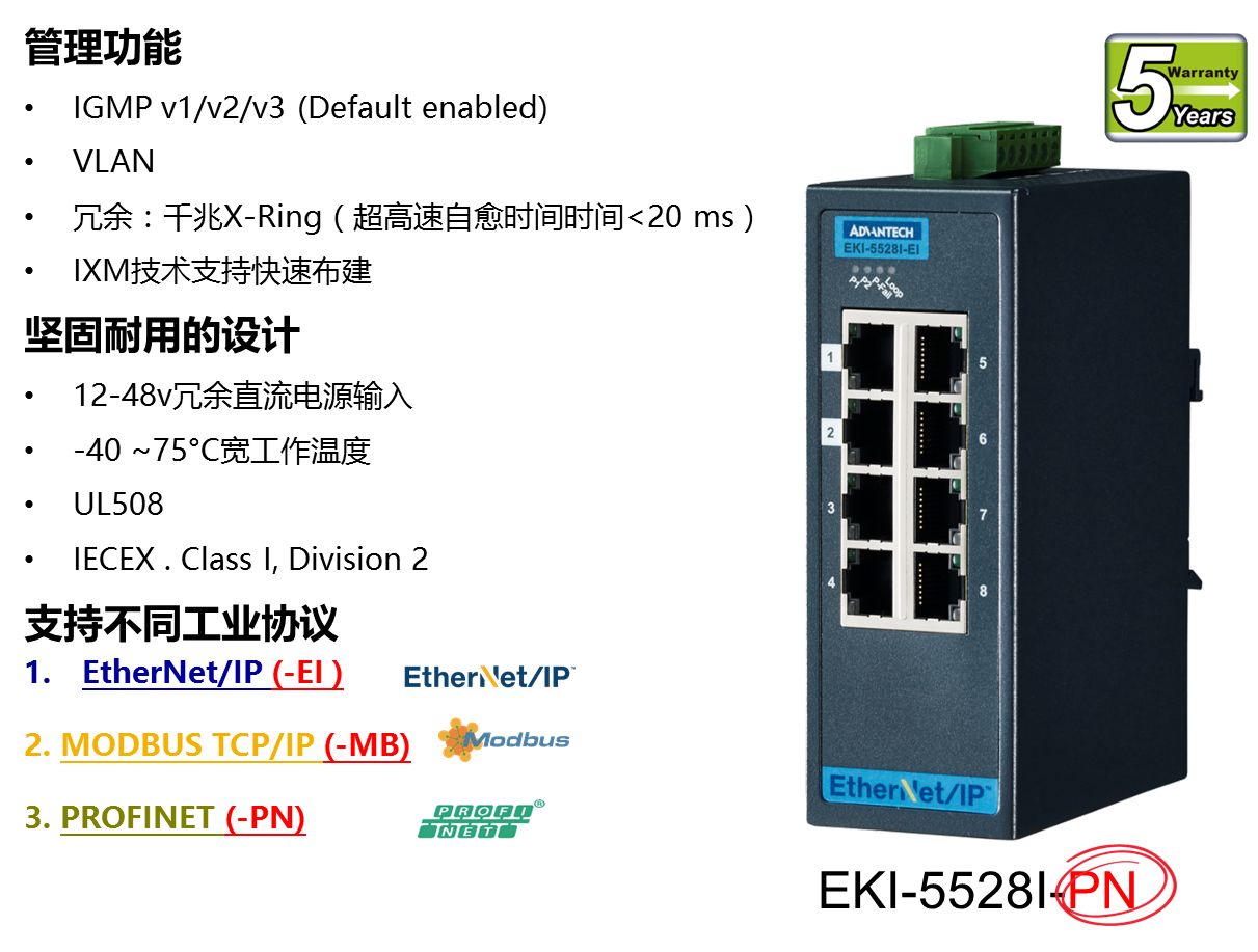 在整套研華PPC-3120S+Webaccess/HMI + 協(xié)議交換機(jī)+協(xié)議網(wǎng)關(guān)的方案中,通過增加IE瀏覽器功能的客制化HMI軟件,PPC-3120S除了可以與PLC做通訊操作界面顯示外,也讓客戶實(shí)現(xiàn)可以通過IE在PPC-3120S上直接查看后臺(tái)服務(wù)器運(yùn)行的MES 系統(tǒng)數(shù)據(jù)以及工位操作SOP。完美解決了將顯示當(dāng)前工位作業(yè)SOP的顯示器與HMI界面進(jìn)行整合需求,節(jié)約了客戶硬件成本同時(shí)實(shí)現(xiàn)工位空間布局優(yōu)化。 ▌▌相關(guān)產(chǎn)品EKI-5500/5600系列交換機(jī)