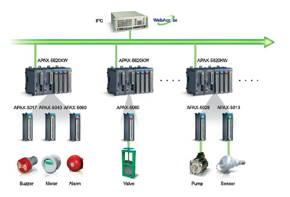 ▌▌系統(tǒng)總覽: 為了滿足Easy Control Technology的要求,研華為APAX-5620KW可編程自動(dòng)化控制器(PAC)提供了各種APAX數(shù)字和模擬I / O模塊(包括APAX-5040,APAX-5060,APAX-5017和APAX- 5028),以建立一個(gè)冗余的系統(tǒng)架構(gòu)來監(jiān)控電閘和除砂設(shè)備。相同的配置還用于監(jiān)視電源系統(tǒng)中的發(fā)電機(jī)和配電面板。五個(gè)帶有APAX-5013 8通道RTD模塊的APAX產(chǎn)品可采集數(shù)據(jù)并控制泵,壓力,水位,流量,電動(dòng)蝶閥等。對(duì)于這三個(gè)區(qū)域的數(shù)據(jù)采集和現(xiàn)場(chǎng)控制,核心是APAX- 5620KW控制器。其雙CPU模塊架構(gòu)獨(dú)立運(yùn)行,可提供高性能計(jì)算并執(zhí)行輸入和輸出控制任務(wù)。此外,冗余機(jī)制將I / O處理程序存儲(chǔ)在兩個(gè)獨(dú)立系統(tǒng)中的兩個(gè)控制器上。主控制器執(zhí)行I / O操作,當(dāng)主控制器發(fā)生故障時(shí),備用控制器將自動(dòng)快速接管。這種獨(dú)特的雙控制器架構(gòu)為穩(wěn)定且不間斷的應(yīng)用提供了出色的可靠性。在建筑物的中央控制室中安裝了ATX主板AIMB-781,可機(jī)架安裝的ACP-4000機(jī)箱和研華WebAccess HMI / SCADA軟件。其易于使用的用戶界面為管理人員提供了動(dòng)態(tài)圖形顯示和實(shí)時(shí)數(shù)據(jù)控制。基于瀏覽器的軟件還允許地方和中央政府部門隨時(shí)遠(yuǎn)程監(jiān)視水產(chǎn)養(yǎng)殖生產(chǎn)區(qū)的狀況。此外,研華還提供了支持簡(jiǎn)單網(wǎng)絡(luò)管理協(xié)議(SNMP)的EKI-4654R和EKI-7659C工業(yè)級(jí)交換機(jī)。通過這些高性能的以太網(wǎng)交換機(jī),該項(xiàng)目的現(xiàn)場(chǎng)硬件設(shè)備與控制室監(jiān)控系統(tǒng)無縫連接,以確保傳輸質(zhì)量。
