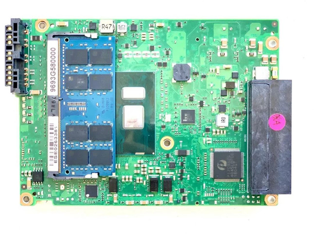 內(nèi)存的大小對(duì)于處理器性能有很大影響,畢竟各種數(shù)據(jù)都是要經(jīng)過內(nèi)存來送給計(jì)算機(jī)。在這塊電路板上搭載有兩個(gè)DDR4內(nèi)存卡槽,對(duì)稱的分布在電路板的兩面上。官方資料中說最大支持到32GB,也就是一個(gè)內(nèi)存卡槽最大支持16GB的內(nèi)存條。實(shí)測(cè)的這臺(tái)控制器上只插有一根8GB內(nèi)存條,但足以應(yīng)對(duì)小規(guī)模的應(yīng)用場(chǎng)合。