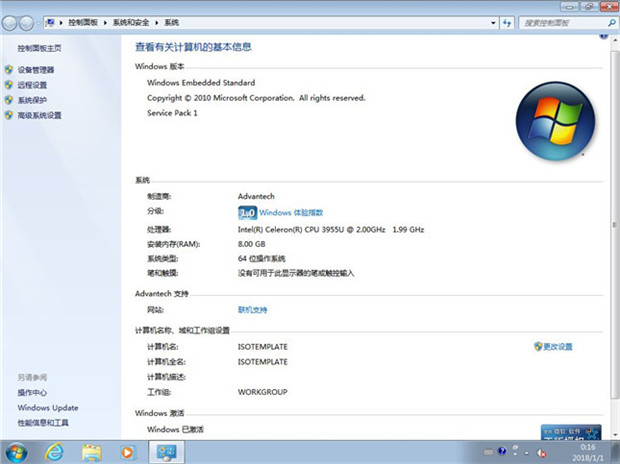 還是那個(gè)熟悉的Windows系統(tǒng)界面,在“我的電腦”的屬性中可以查看到這臺(tái)計(jì)算機(jī)的更多基本信息。界面顯示這臺(tái)計(jì)算機(jī)的制造商是Advantech(研華),安裝的是64位系統(tǒng),8G內(nèi)存,搭載英特爾賽揚(yáng)3955U處理器,主頻是2.00GHz。