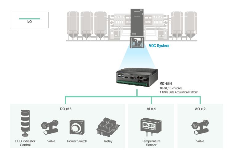 ▌▌系統(tǒng)描述 研華的MIC-1816是配有DAQ模塊的嵌入式計算機。該系統(tǒng)的緊湊,無風(fēng)扇設(shè)計使其成為有限空間安裝的理想選擇。在此項目中,MIC-1816安裝在機柜中,以連接熱電偶,進(jìn)氣門,氣門按鈕和帶LED指示燈的繼電器。這允許將VOC測量系統(tǒng)用于收集傳感器信號并控制相關(guān)設(shè)備,從而調(diào)節(jié)溫度和VOC濃度。 MIC-1816是業(yè)界首個嵌入式DAQ平臺。盡管該設(shè)備是緊湊型(165 x 130 x 59 mm)且手掌大小,但它提供了足夠的計算能力來滿足該項目的要求。該系統(tǒng)對集成的高度支持使該公司可以用一個平臺替換以前的“拼布”硬件。多功能I / O(包括模擬輸入,模擬輸出,數(shù)字輸入和數(shù)字輸出)允許用戶連接到多個設(shè)備并管理各種組件。此外,提供16位分辨率的數(shù)據(jù)采集可以提高測量的準(zhǔn)確性,并且可拆卸的接線盒可以直接連接到傳感器,以方便安裝和維護。 最后,為了防止盜版并保護客戶的知識產(chǎn)權(quán),研華可以將MIC-1816嵌入具有唯一設(shè)備ID的EEPROM中。使用此定制功能(應(yīng)要求提供),只有在設(shè)備ID與EEPROM中的設(shè)備ID匹配時,MIC-1816系統(tǒng)才能運行。這是為了防止其他制造商復(fù)制VOC測量系統(tǒng)的功能,即使它們使用相同的硬件組件也是如此。 ▌▌項目實施